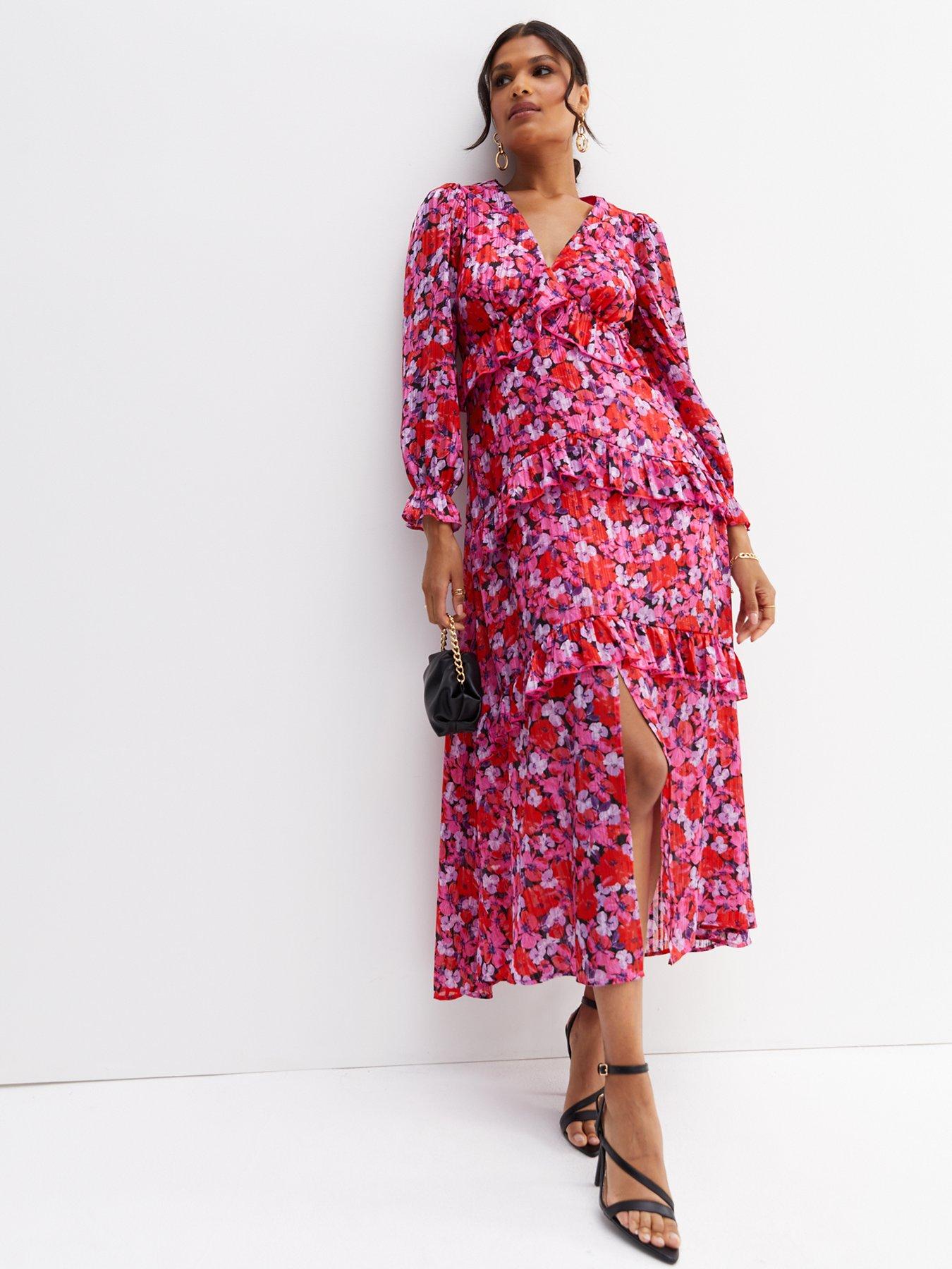New Look Red Floral Chiffon Tiered Ruffle Long Sleeve Midi Dress Very Co Uk